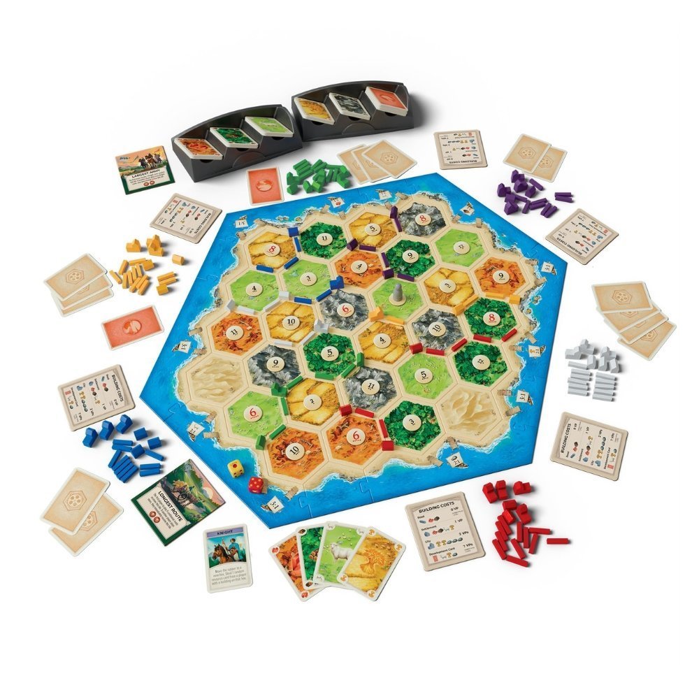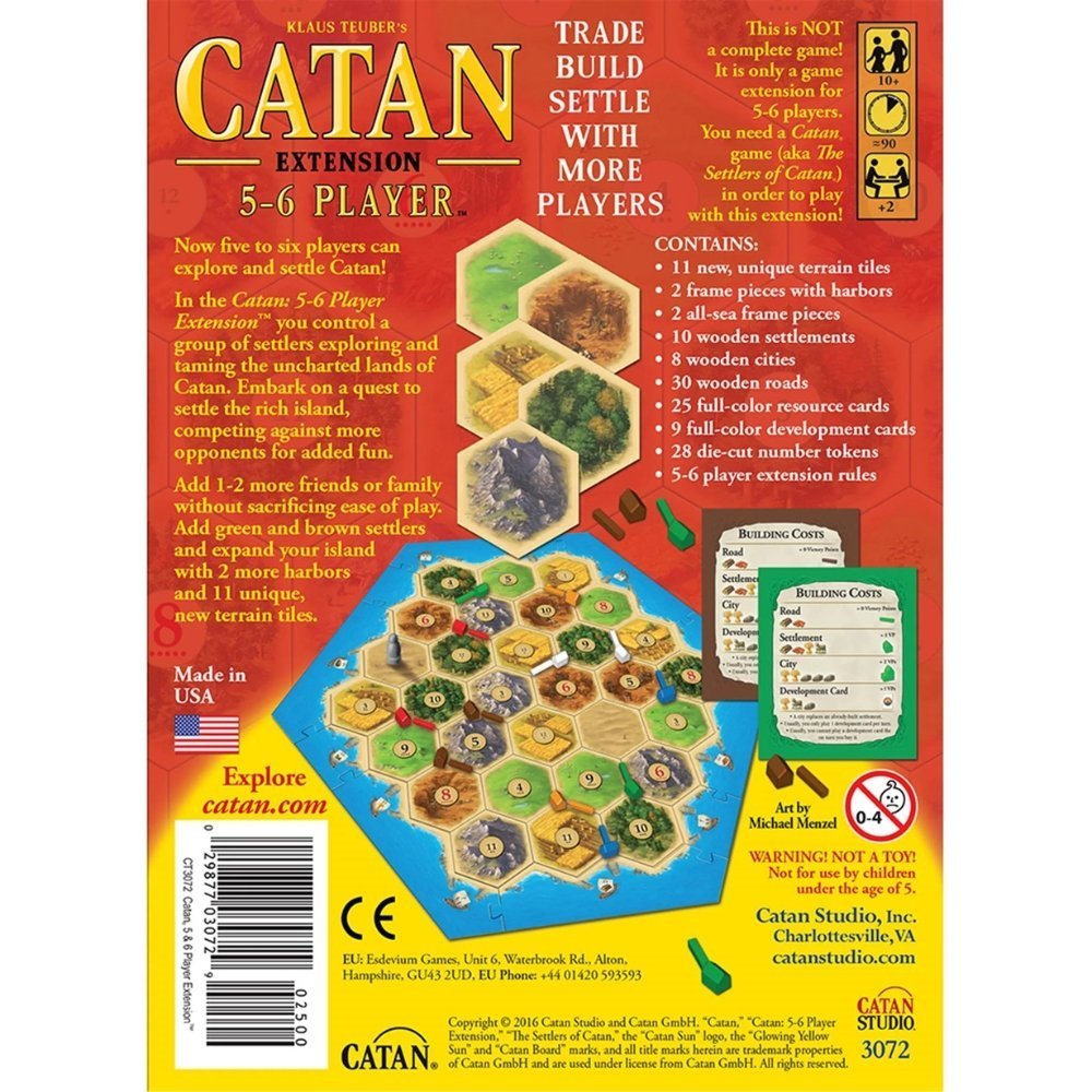 - Includes: Extra terrain hexes, resource and development cards, additional roads, settlements, cities, and game pieces for 2 more players