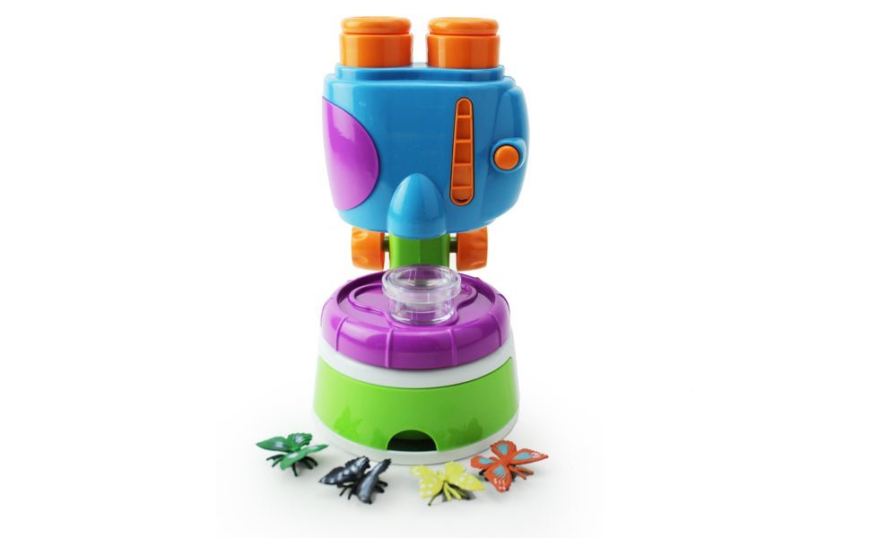 - Inside the Kit, you’ll find a colorful adjustable microscope with real magnifying glasses and a rotating tray. There are also four unique toy butterflies and a clear container included. Plus, theres a side button to illuminate your specimen!