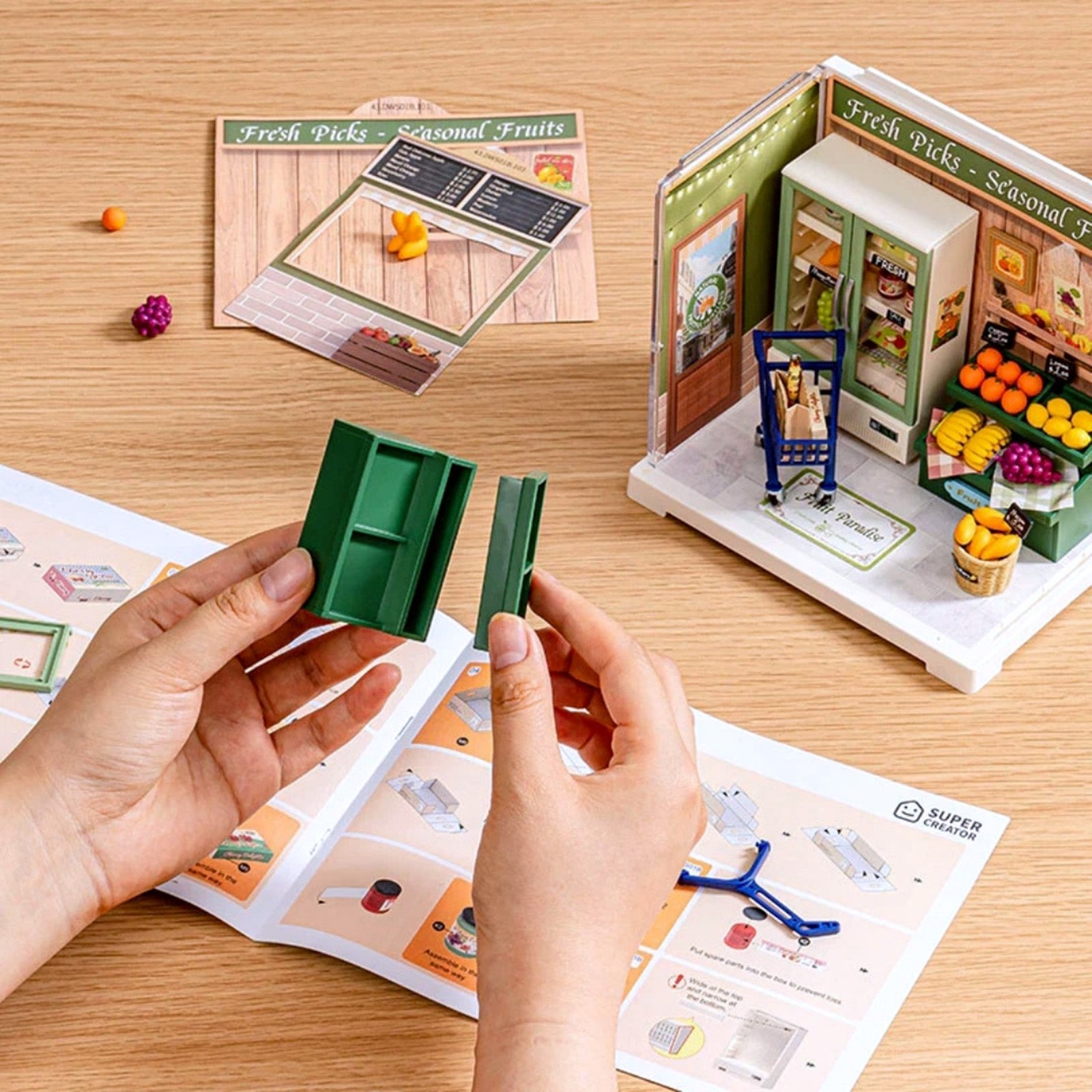 Bring the vibrant energy of a fresh market to life with this delightful DIY miniature kit, thoughtfully designed in a smaller scale than our original Super Creator series. Overflowing with colorful fruits, rustic crates, and charming market details, this miniature scene captures the joy of a sunny day spent browsing local produce. From crisp apples to juicy oranges and bunches of bananas, every detail is thoughtfully crafted to create a warm, cheerful atmosphere. A perfect project for crafters who love scenes full of life and color!