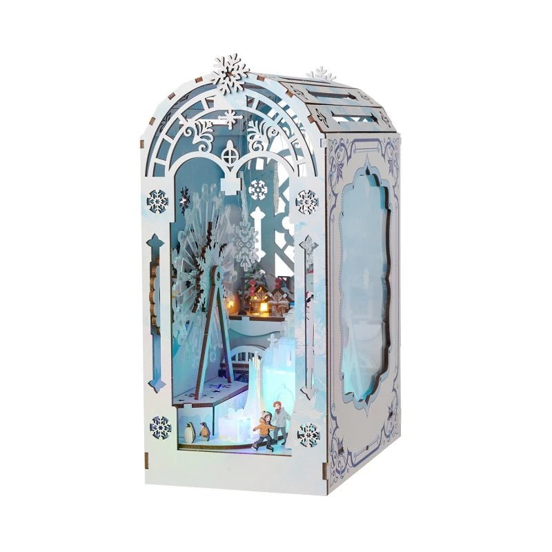 Immersive Fantasy Design: Modeled after dreamy winter carnivals and magical ice castles, this handcrafted 3D wooden puzzle transforms into a stunning book nook full of life, lights, and story.